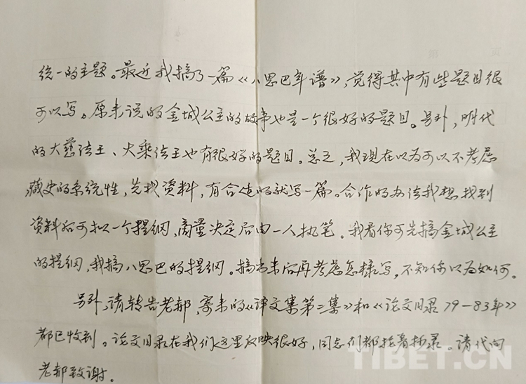 记得我大学毕业刚到新单位,人生地不熟,加之原来沉浸在“文学梦”中,现在陡然转到藏族历史研究,所谓基础不牢地动山摇,困惑加不适,可想而知。陈老师在聊天中得知我的情况后,谈到文史不分家,自己对文学也很有兴趣,与青海《瀚海潮》编辑很熟悉。这样,我遇到一个学识渊博的良师益友,聆听指教,何其难得。在陈老师的鼓励和帮助下,我在惶惑中尝试把历史与文学结合起来,与他合作发表了历史故事新编《长安和亲》《香波山奇遇—吐蕃聂墀赞普的故事》等,平稳地完成了专业变动的过渡期。后来,他离开中央民族学院到青海社会科学院工作,我们之间仍坚持信件往来,得到他很多帮助。每一次通信,我们谈得最多的都是学术。在某次回信中,他谈及下一步合作的工作,特别提到“至于今后如何搞,我想原来定的历史故事新编计划似乎是太大了一点。主要从藏族史的系统性考虑,而没有考虑到现实的需要。所以我想还是先写主题符合现实需要的题目,写歌颂民族团结、文化交流,国家统一的主题。最近,我搞了一篇《八思巴年谱》,觉得其中有些题目很可以写。原来说的金城公主的故事也是一个很好的题目。另外,明代的大慈法王、大乘法王也有很好的题目。总之,我现在认为可以不考虑藏族史的系统性,先找资料,有合适的就写一篇。合作的办法我想找到资料后,可拟一个提纲,商量决定后,由一人执笔。我看你可先搞金城公主的提纲,我搞八思巴的提纲,搞出来后再考虑怎样写,不知你以为如何。”