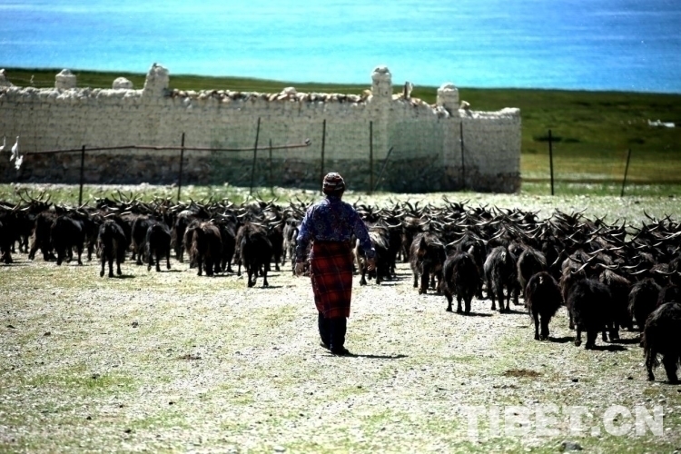 资料图:阿里地区措勤县牧民驱赶着紫绒山羊群前往扎日南木错湖边