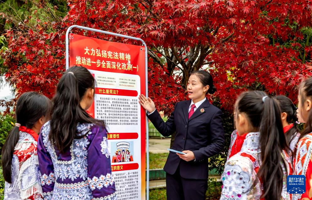 12月3日,贵州省黔西市人民检察院的检察干警在新仁苗族乡化竹小学为学生普及宪法知识。