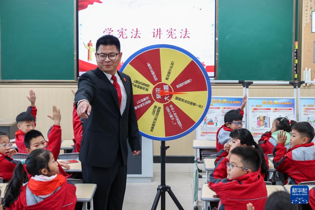 12月3日,在浙江省湖州市德清县雷甸镇中心小学,德清县人民法院雷甸人民法庭工作人员通过知识大转盘为学生普及宪法知识。