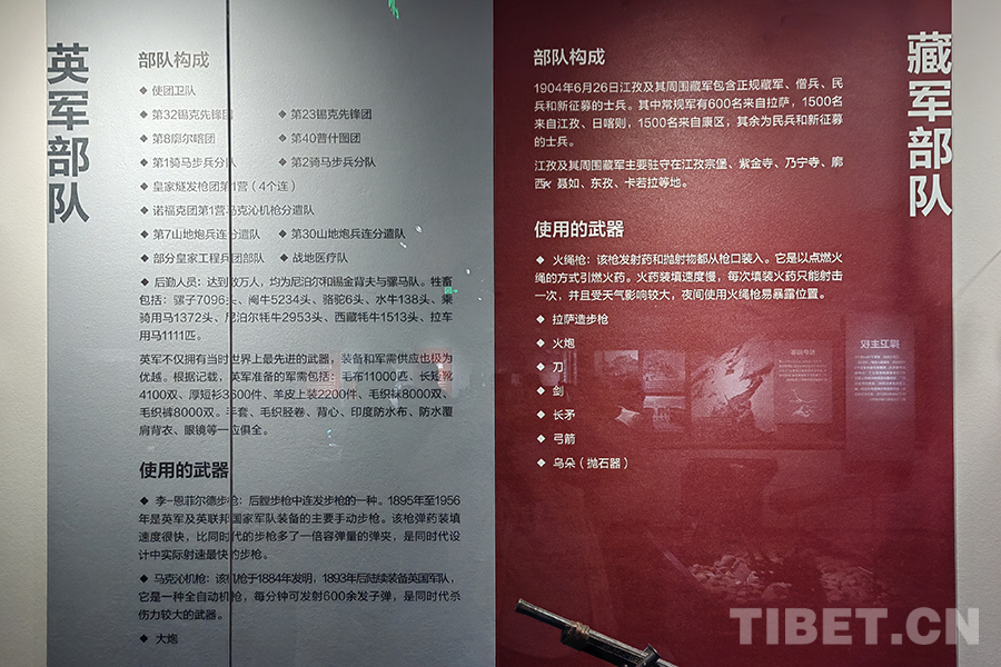 图为宗山号角——纪念西藏江孜抗英保卫战120周年主题展,对比英帝国主义侵略者与当时江孜守军军力情况的展板 摄影:杨月云