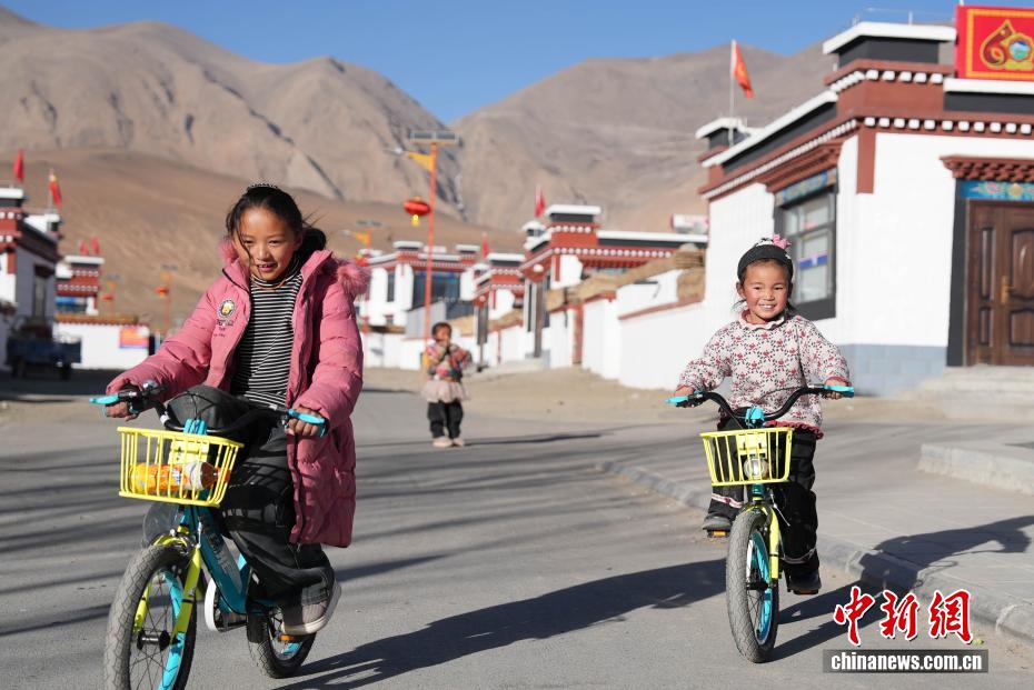 2025年1月7日,西藏日喀则市定日县发生6.8级地震,造成重大人员伤亡。地震发生后,30天内完成民房重建规划、选址、设计,90天内完成灾后恢复重建总体方案编制和报审,震后100天内进入项目全面实施阶段,220天实现灾后恢复重建首批入住目标,295天实现重建民房、维修加固民房基本建成并交付受灾民众,在海拔4300米以上极度缺氧、建材短缺、施工力量薄弱的地震灾区,创造了“当年受灾、当年入住”的重建奇迹。如今,民众生产生活恢复秩序,他们将在新居内迎接第一个日喀则农事新年。图为2026年1月5日,定日县长所乡森嘎村,两个小女孩在新房前骑车。贡确 摄