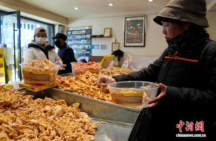 随着春节、藏历新年日益临近,西藏拉萨街头年味渐浓。4日,在拉萨市城关区林廓北路等路段,沿街不少商店都在制作、售卖卡塞。