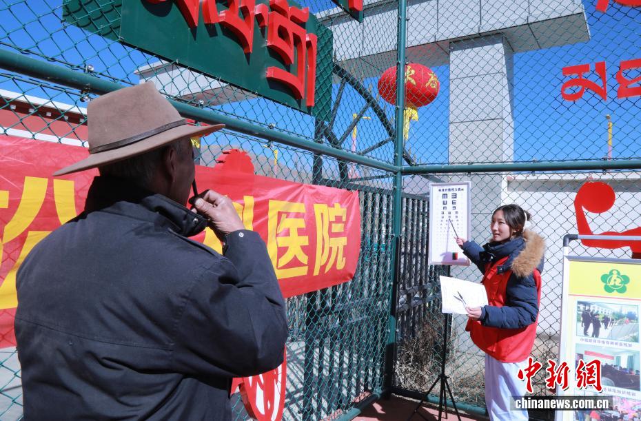 2月6日,春节、藏历新年来临之际,西藏拉萨市墨竹工卡县残疾人联合会在墨竹工卡县残疾人综合服务中心开展“残疾人文化进社区”活动,丰富残疾人精神文化生活,传递社会温情。活动现场张灯结彩,歌舞节目轮番上演,充分展现残疾人积极向上的精神风貌。工作人员为残疾人送上慰问品与双节祝福;义诊区提供健康检测、康复指导服务;手工艺展区陈列着残疾人制作的藏式手工艺品;趣味游戏区开展无障碍互动活动,现场欢声笑语不断。图为志愿者给残疾人测视力。