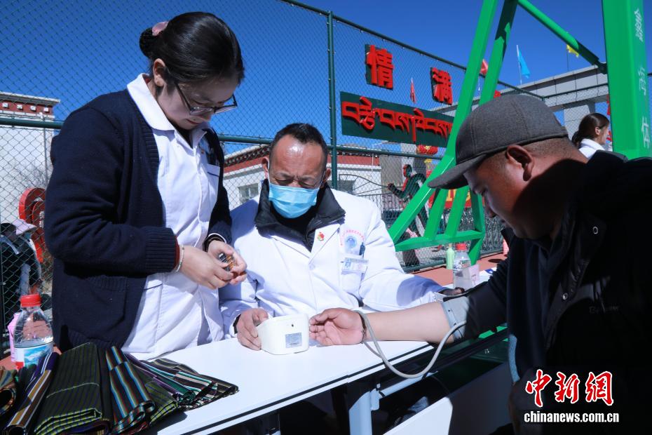 2月6日,春节、藏历新年来临之际,西藏拉萨市墨竹工卡县残疾人联合会在墨竹工卡县残疾人综合服务中心开展“残疾人文化进社区”活动,丰富残疾人精神文化生活,传递社会温情。活动现场张灯结彩,歌舞节目轮番上演,充分展现残疾人积极向上的精神风貌。工作人员为残疾人送上慰问品与双节祝福;义诊区提供健康检测、康复指导服务;手工艺展区陈列着残疾人制作的藏式手工艺品;趣味游戏区开展无障碍互动活动,现场欢声笑语不断。图为医生为残疾人测量血压。