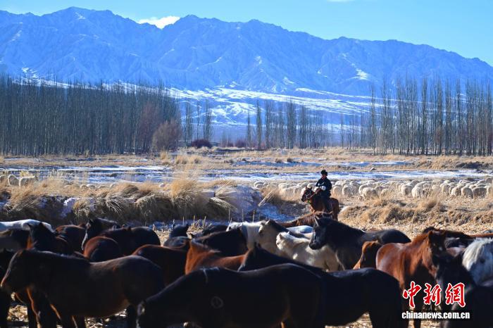 寒冬时节,中新社、中新网记者走进甘肃省酒泉市肃北县党城湾镇浩布勒格村,该村年轻的养马人其乌抠每天骑马去草场给马匹拉水、投喂饲料。闲暇时,他还会使用无人机观察马匹的动态行踪,通过网络平台分享自家马儿的视频。
