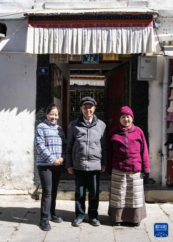 洛桑贡布(中)和大儿媳央金(左)、老伴次仁白姆在家门口前合影(3月27日摄)。