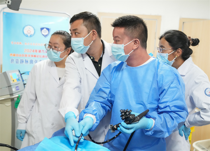 7月8日,在西藏日喀则市人民医院,第九批医疗人才“组团式”援藏专家、复旦大学附属中山医院内镜中心副主任医师胡健卫(左二)指导徒弟张武(左三)进行内镜手术。新华社记者 丁汀 摄/新华社图片库