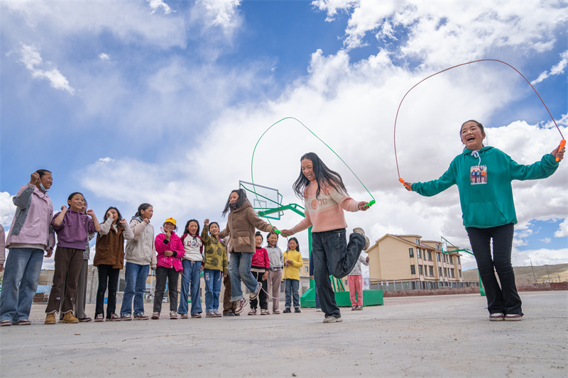 6月22日,西藏那曲市班戈县中石化小学学生在操场上跳绳。作为目前全国海拔最高的援藏小学,班戈县中石化小学有“离天空最近的援藏小学”之称。新华社记者 丁增尼达 摄/新华社图片库