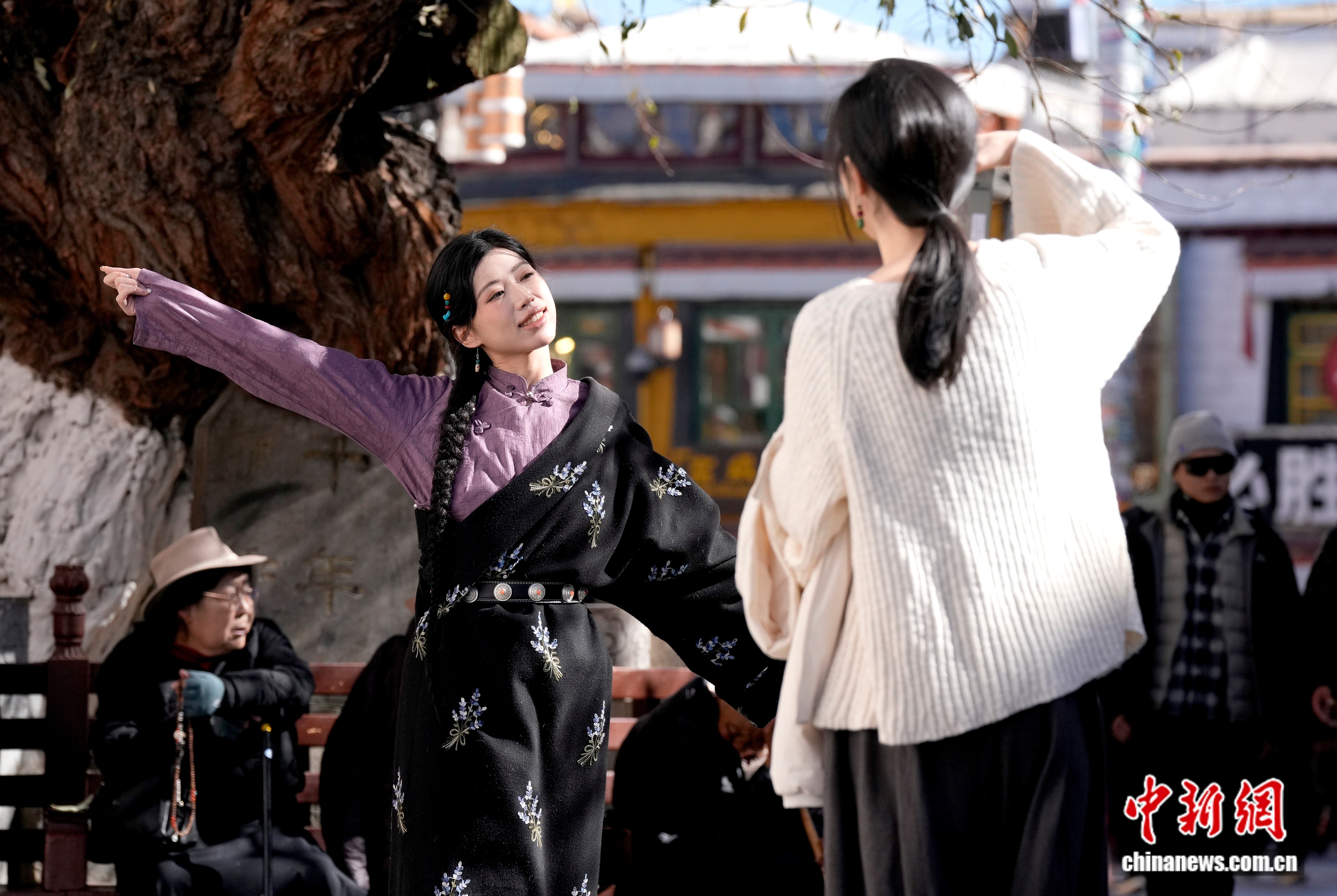 2025年12月24日,游客在拉萨市八廓街拍摄藏服写真。在第八轮“冬游西藏”活动持续推动下,不少游客选择在冬季走进西藏,感受雪域高原的独特魅力。中新社记者 李林 摄