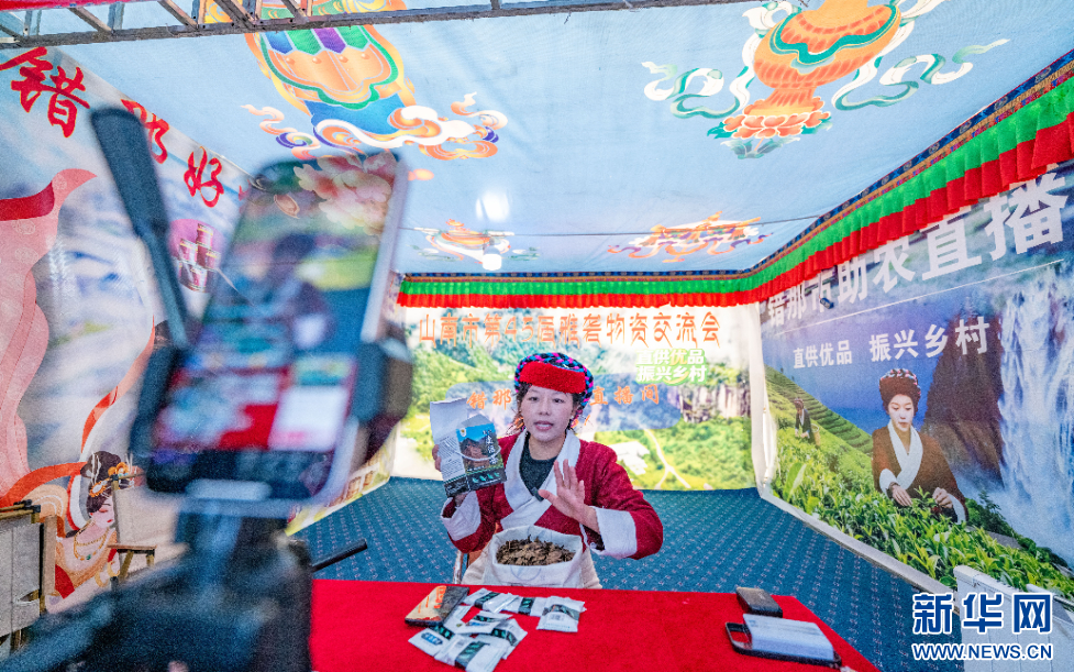12月1日,一位电商主播在西藏自治区山南市第45届雅砻物资交流会现场介绍产品。新华网 旦增努布 摄