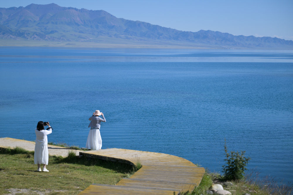 ↑ 游客在赛里木湖畔游玩、拍照(7月9日摄)。