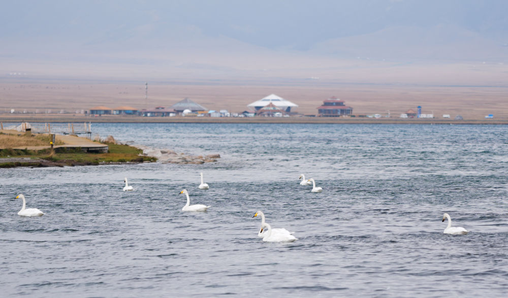 ↑ 9月10日,天鹅在赛里木湖游弋。