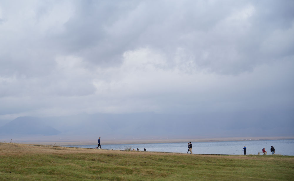 ↑ 9月10日,游客在赛里木湖畔游玩。