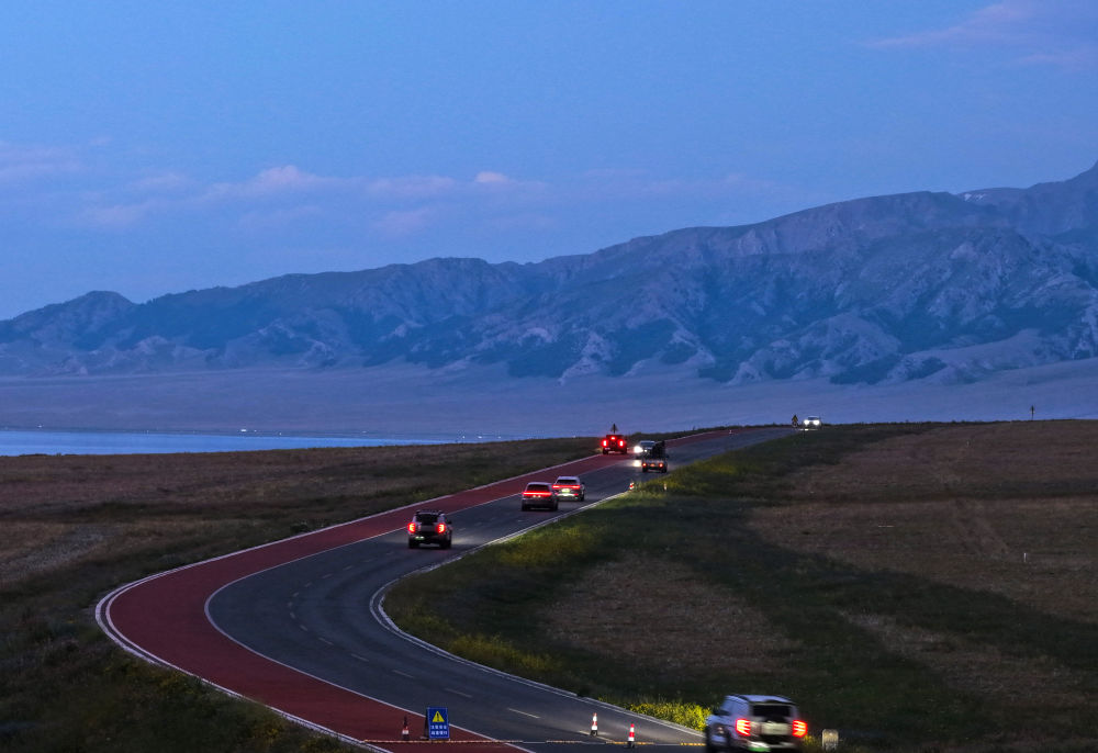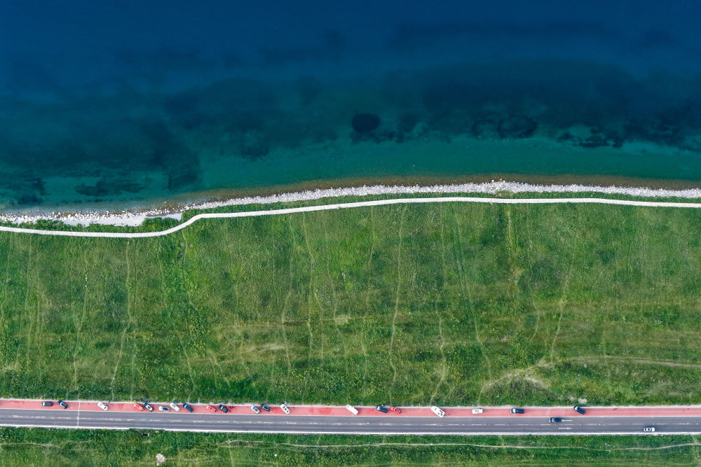 ↑ 游客驾车行驶在赛里木湖景区(无人机照片,7月8日摄)。