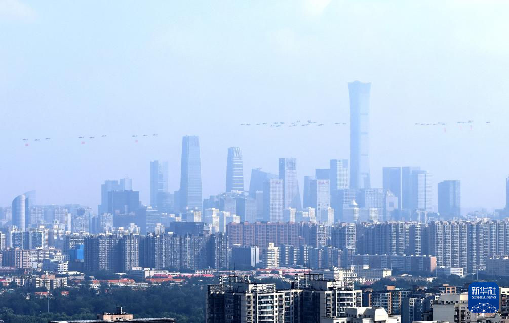 9月3日,纪念中国人民抗日战争暨世界反法西斯战争胜利80周年大会在北京隆重举行。这是空中护旗梯队飞过天安门广场上空。