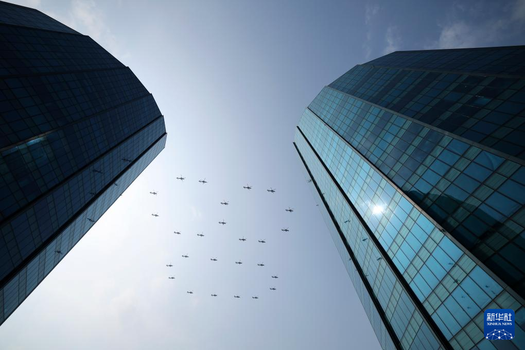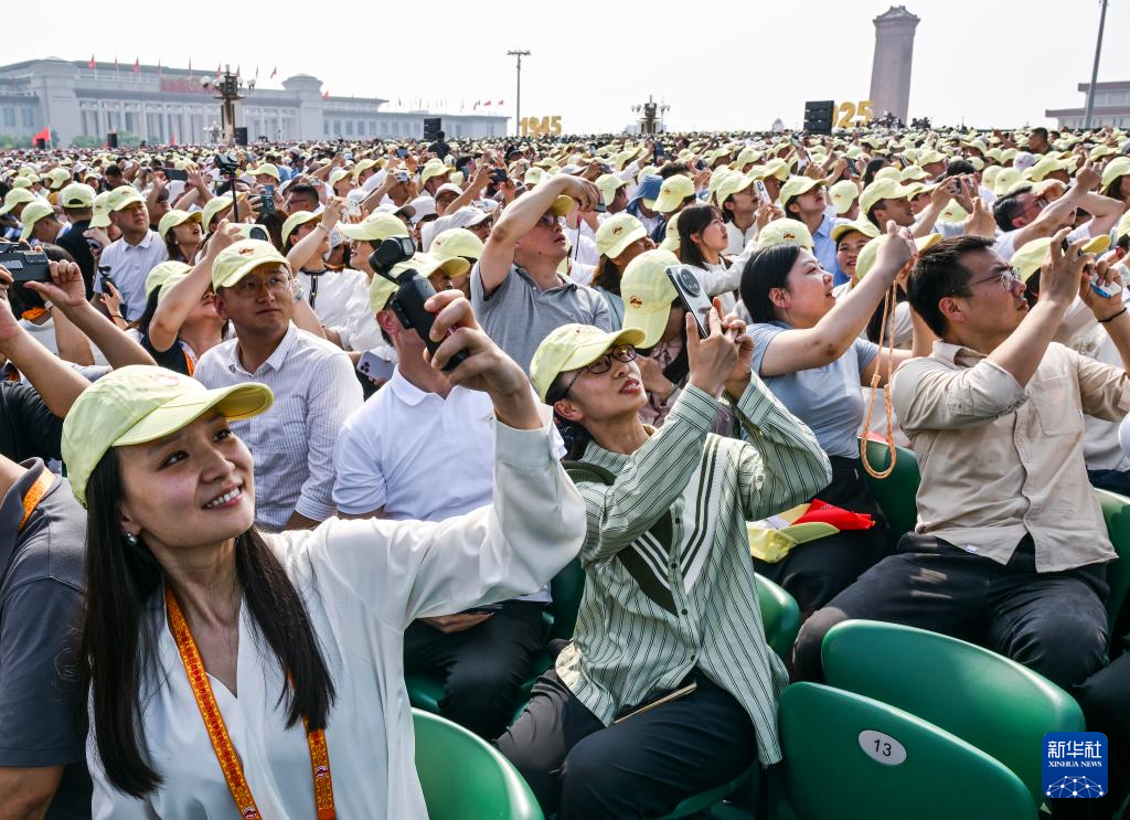 9月3日,纪念中国人民抗日战争暨世界反法西斯战争胜利80周年大会在北京隆重举行。这是观众拍摄空中护旗梯队通过天安门广场。