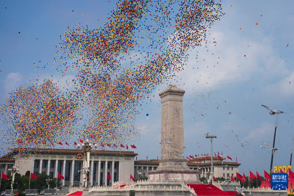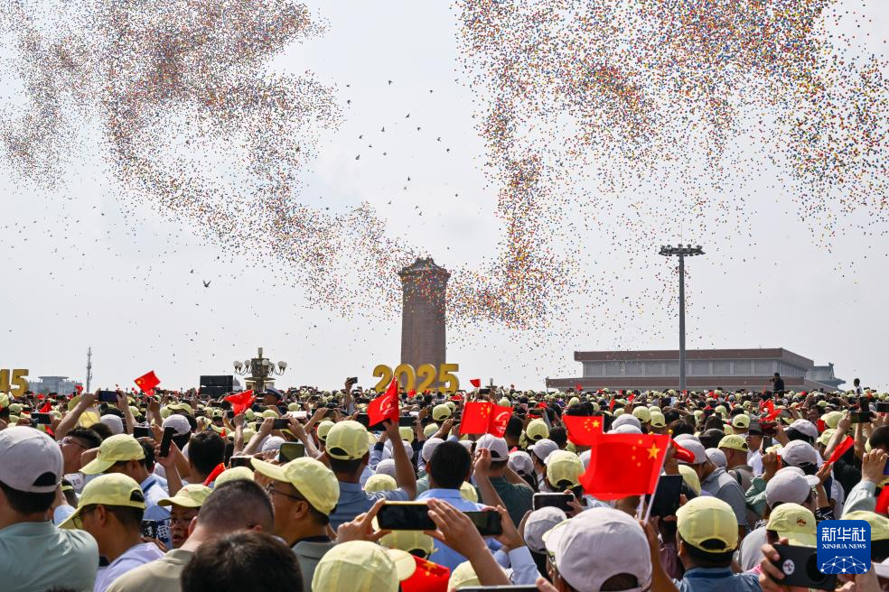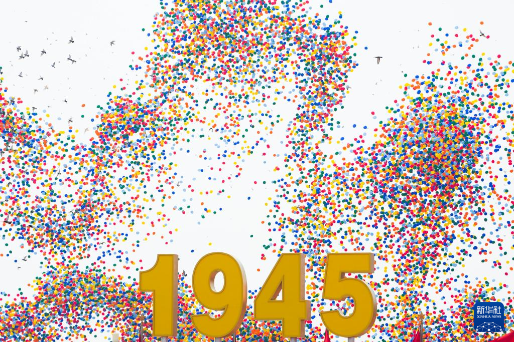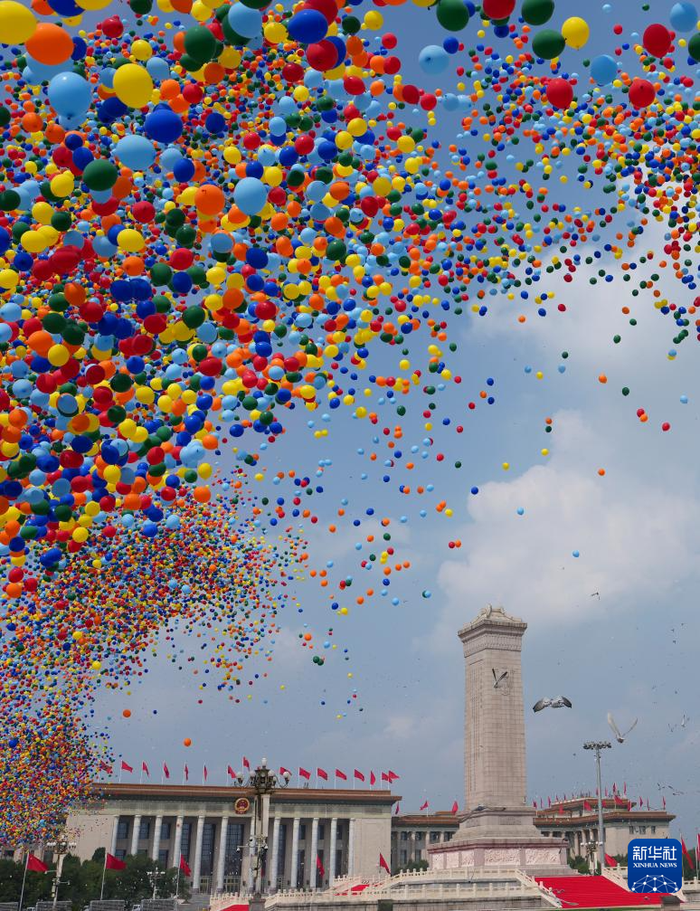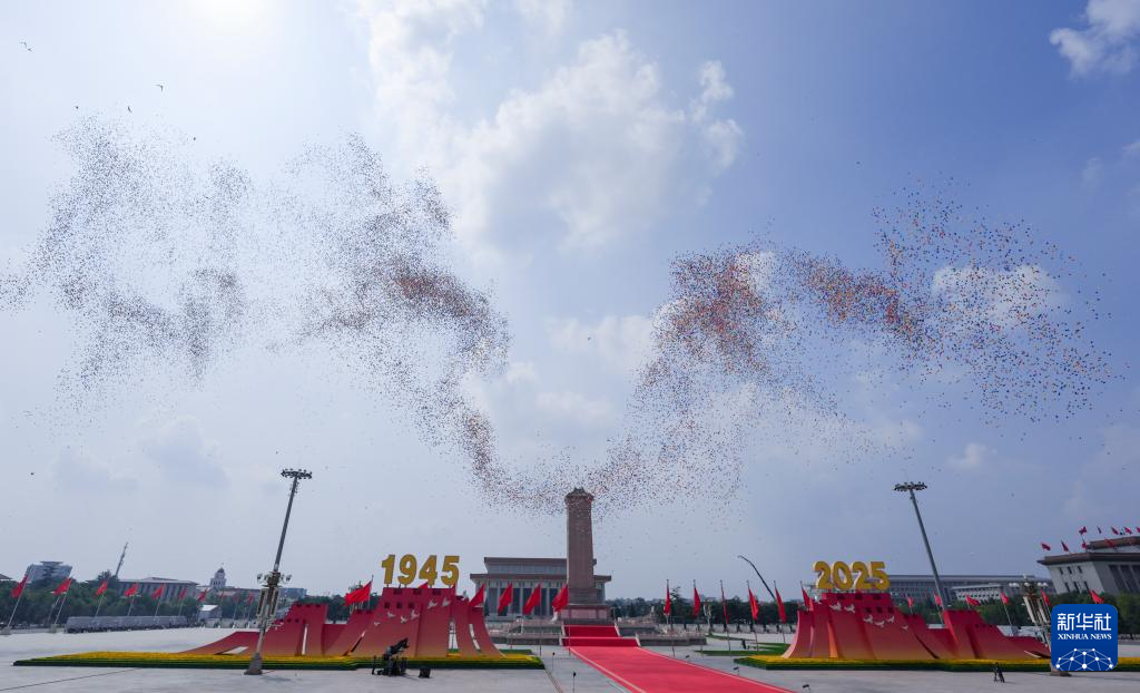 9月3日,纪念中国人民抗日战争暨世界反法西斯战争胜利80周年大会在北京隆重举行。这是纪念大会现场放飞气球。