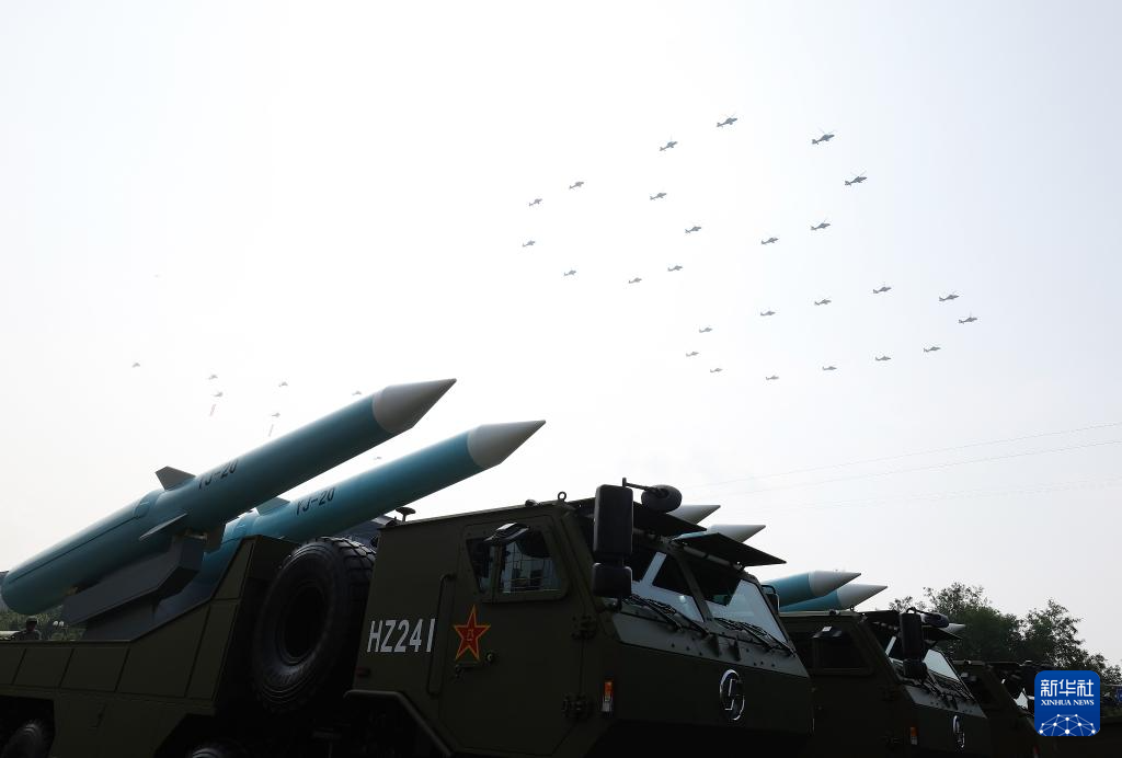 9月3日,纪念中国人民抗日战争暨世界反法西斯战争胜利80周年大会在北京隆重举行。这是空中护旗梯队从反舰导弹方队上空飞过。