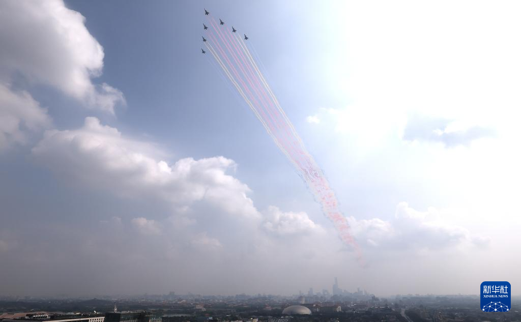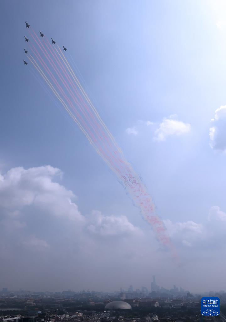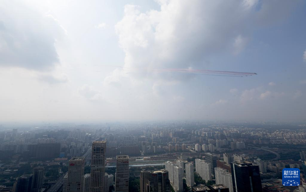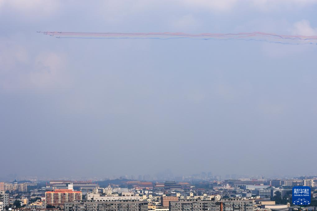 9月3日,纪念中国人民抗日战争暨世界反法西斯战争胜利80周年大会在北京隆重举行。这是教练机梯队通过天安门广场。