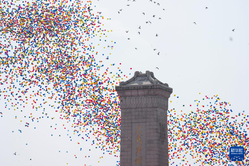 9月3日,纪念中国人民抗日战争暨世界反法西斯战争胜利80周年大会在北京隆重举行。这是纪念大会现场放飞和平鸽和气球。