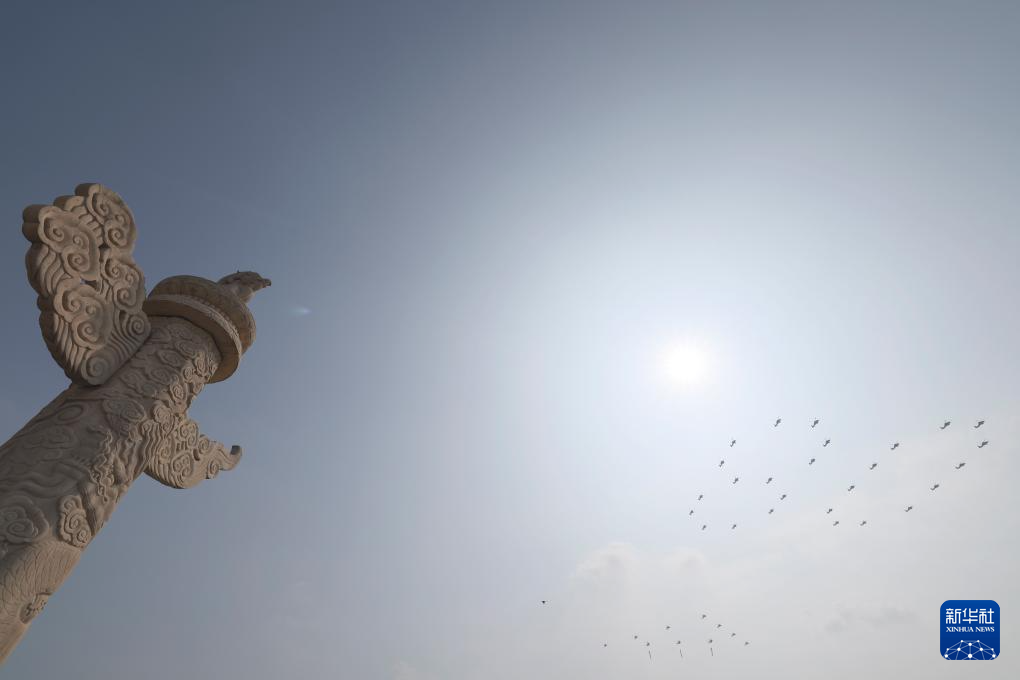 9月3日,纪念中国人民抗日战争暨世界反法西斯战争胜利80周年大会在北京隆重举行。这是空中护旗梯队飞过天安门广场上空。