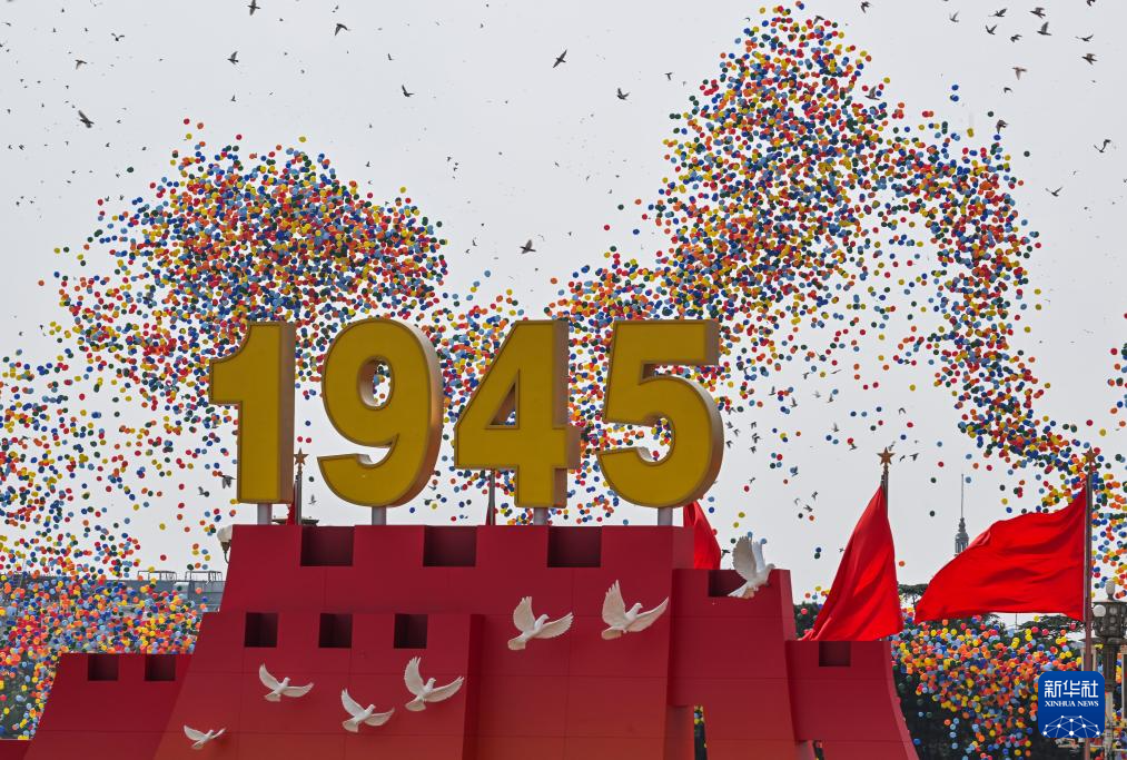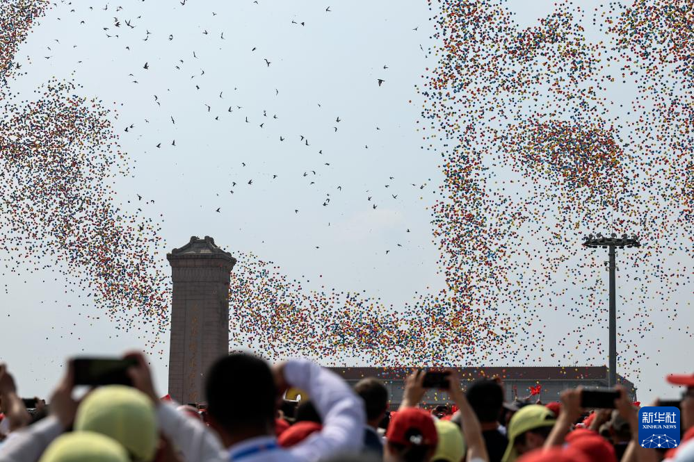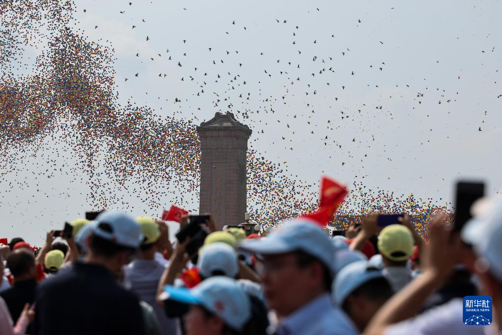 9月3日,纪念中国人民抗日战争暨世界反法西斯战争胜利80周年大会在北京隆重举行。这是纪念大会现场放飞气球和鸽子。