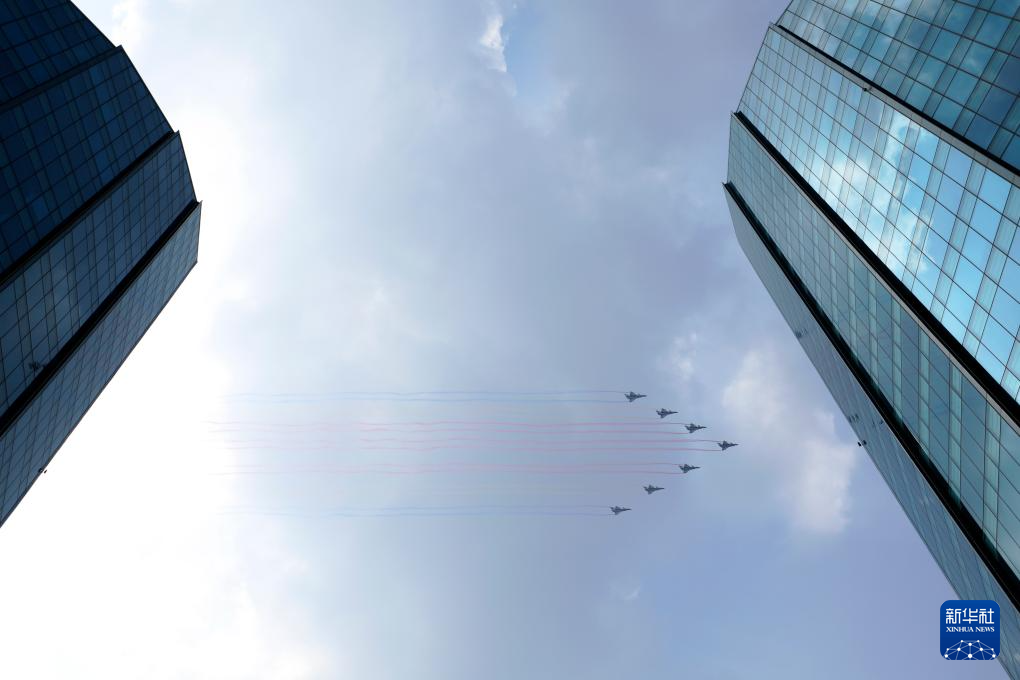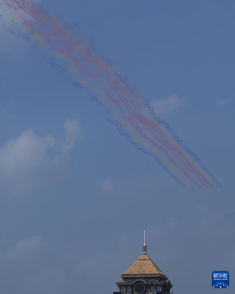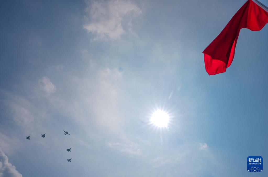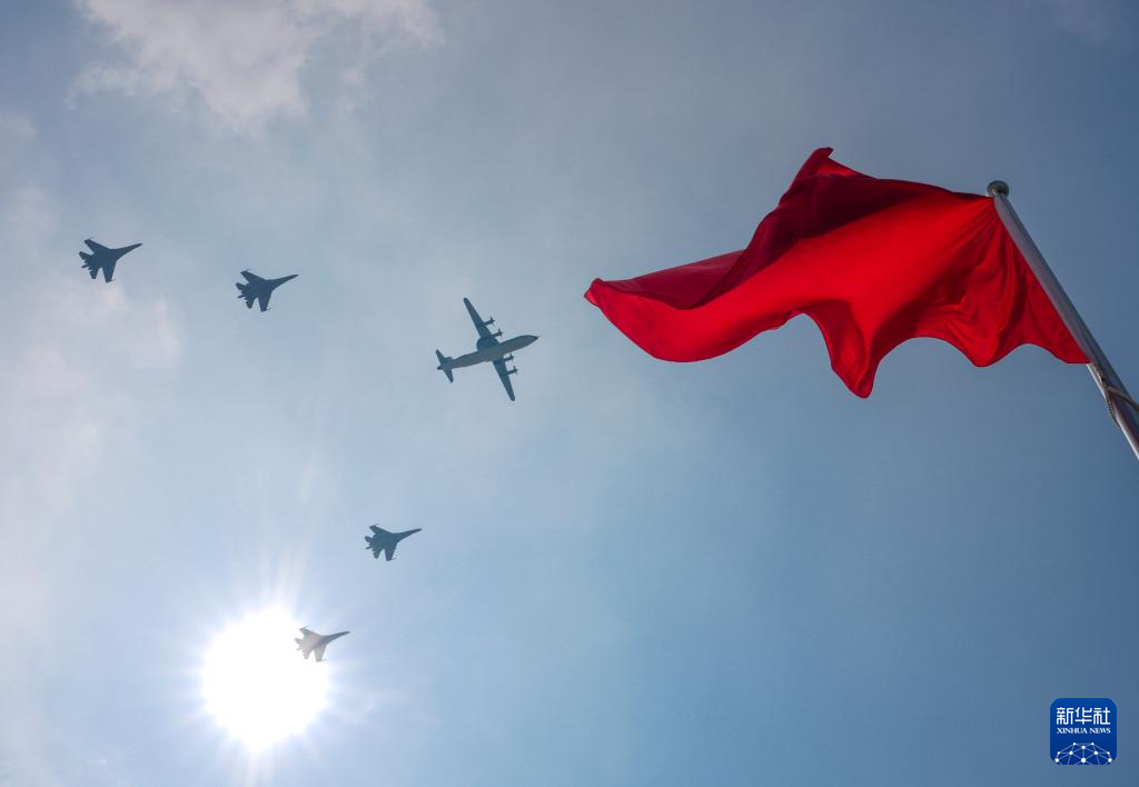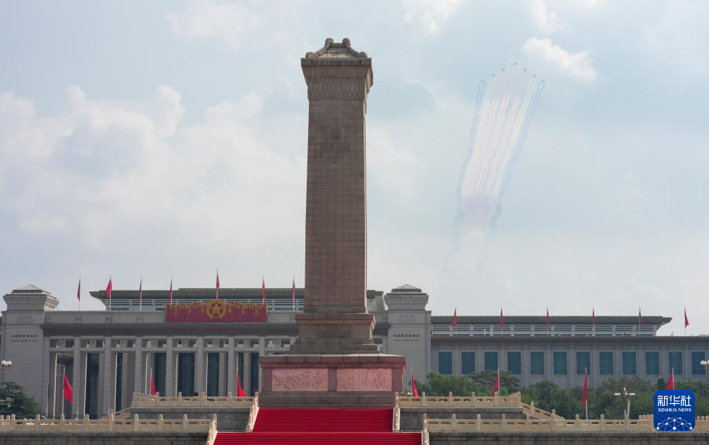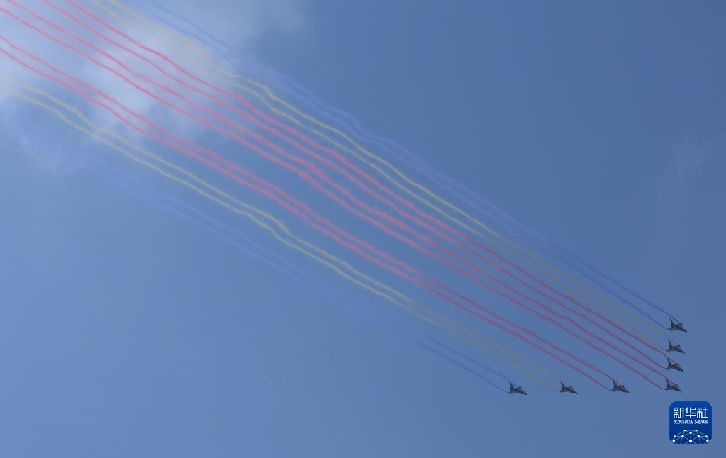 9月3日,纪念中国人民抗日战争暨世界反法西斯战争胜利80周年大会在北京隆重举行。这是空中护旗梯队飞过天安门广场上空。