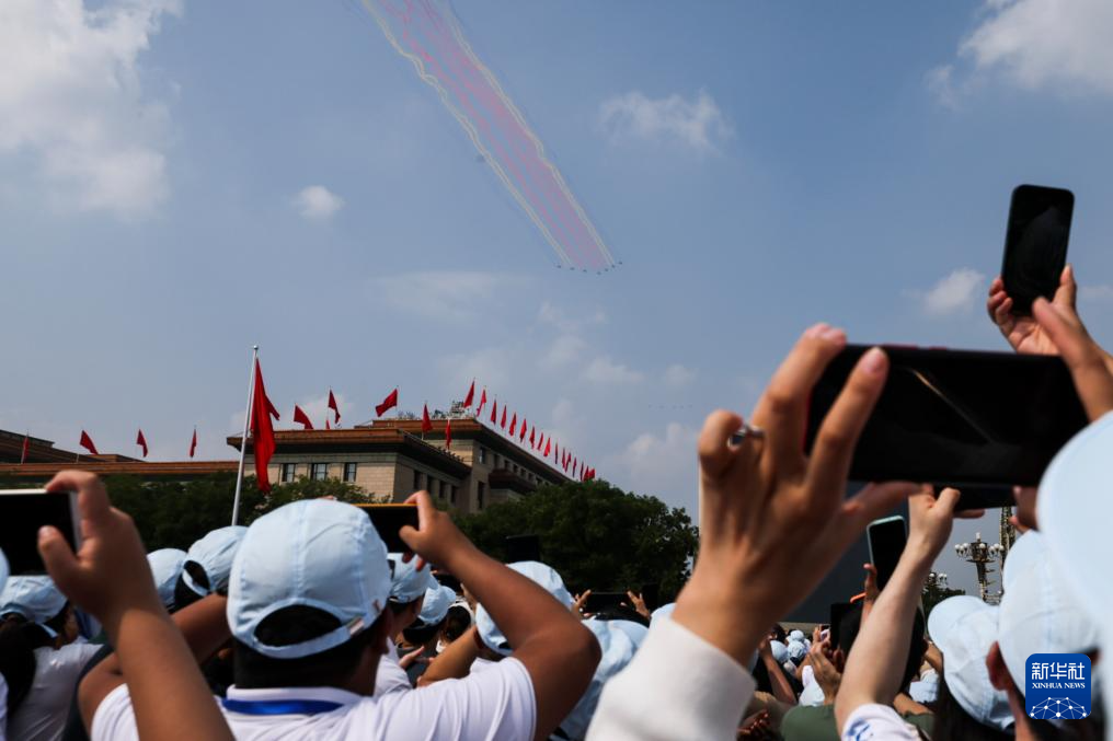 9月3日,纪念中国人民抗日战争暨世界反法西斯战争胜利80周年大会在北京隆重举行。这是观众拍摄教练机梯队接受检阅。
