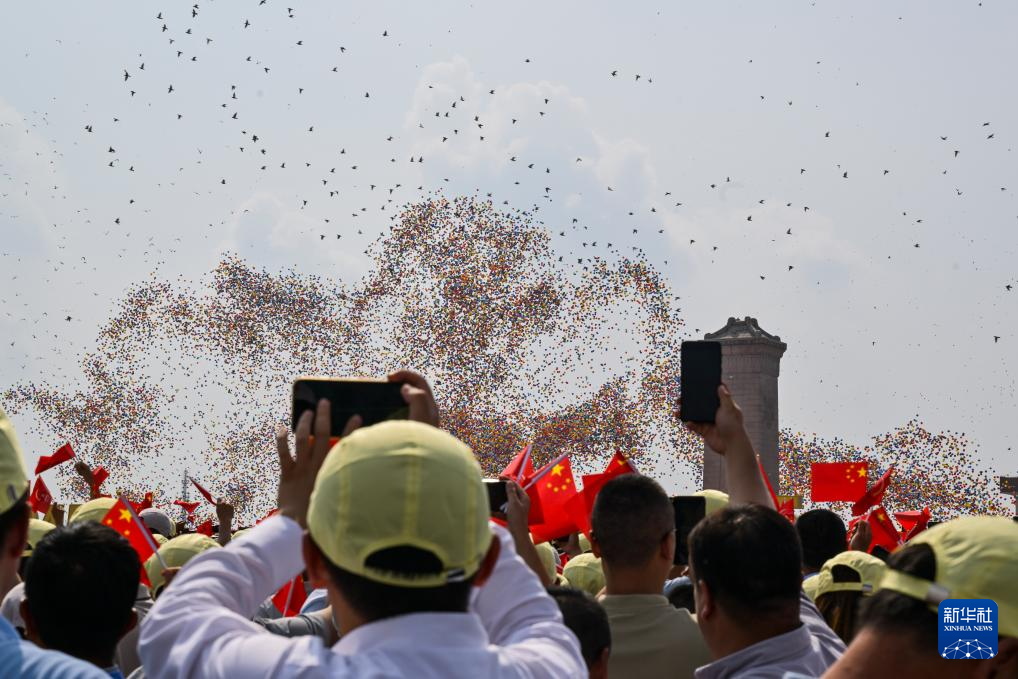 9月3日,纪念中国人民抗日战争暨世界反法西斯战争胜利80周年大会在北京隆重举行。这是观众拍摄纪念大会现场放飞气球和鸽子。