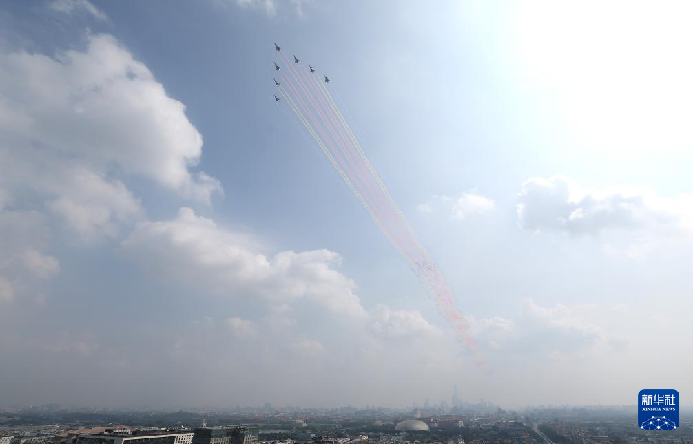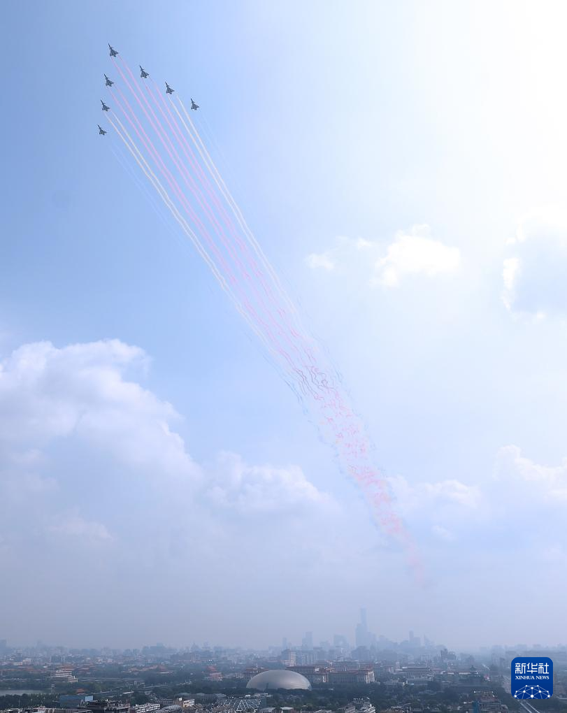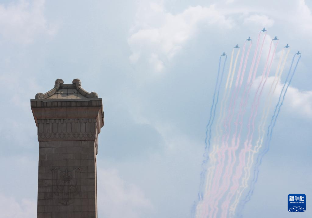 9月3日,纪念中国人民抗日战争暨世界反法西斯战争胜利80周年大会在北京隆重举行。这是教练机梯队通过天安门广场。
