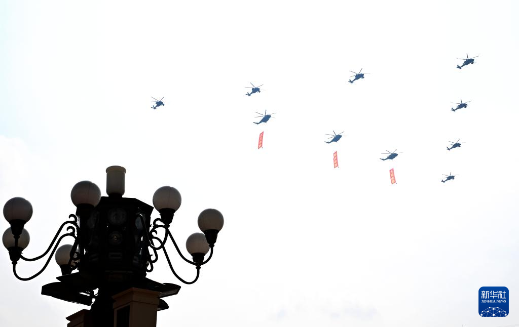 9月3日,纪念中国人民抗日战争暨世界反法西斯战争胜利80周年大会在北京隆重举行。这是空中护旗梯队通过天安门广场。