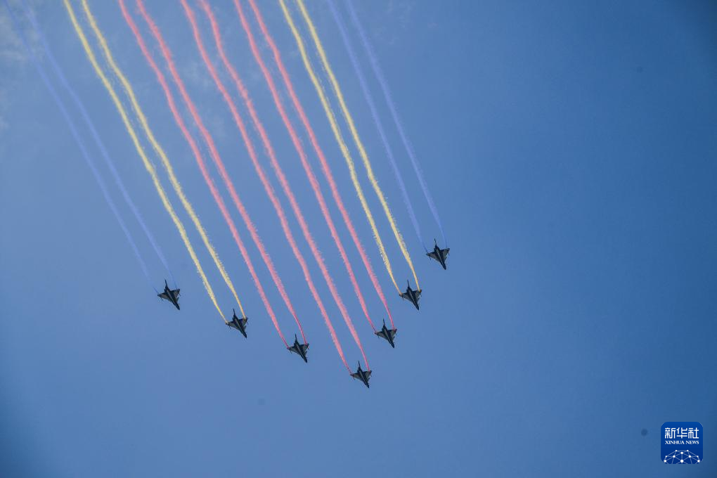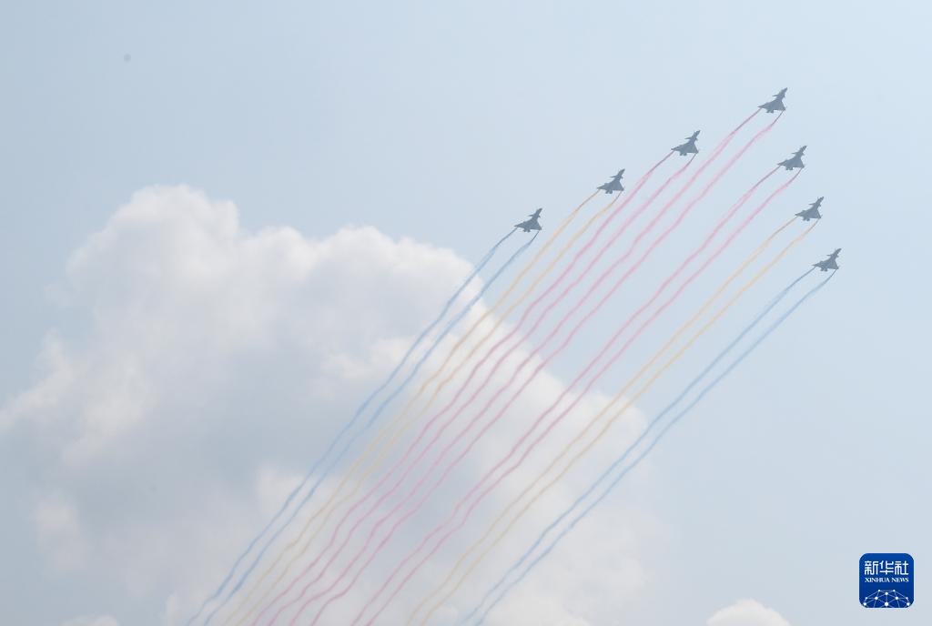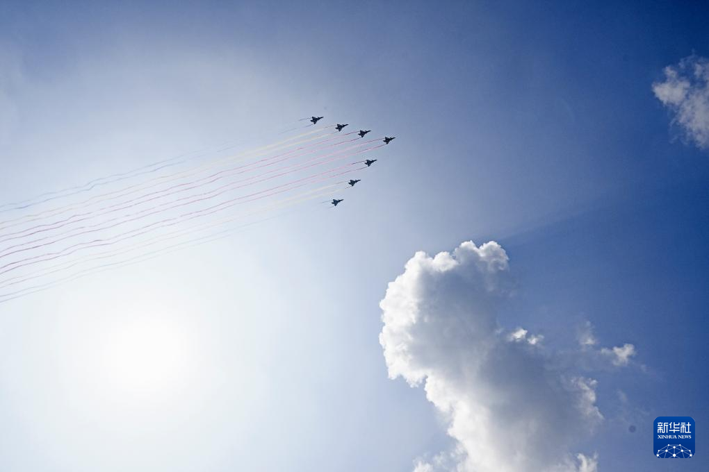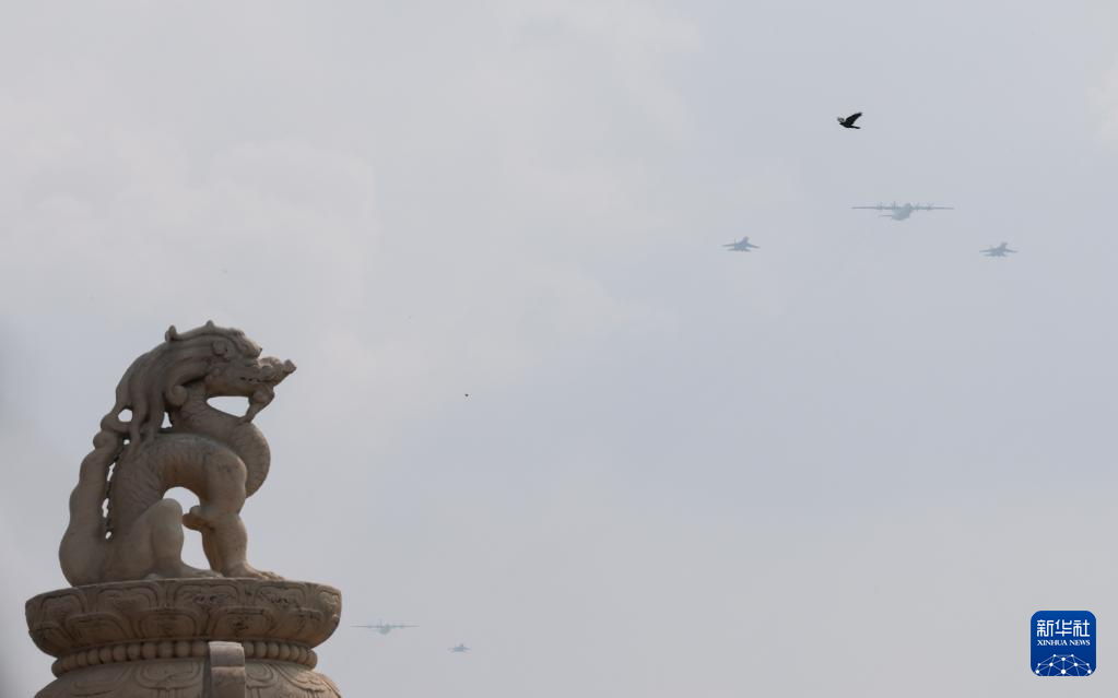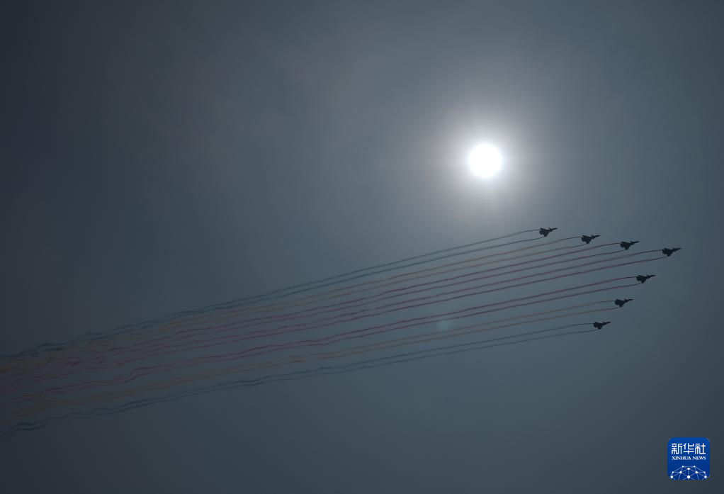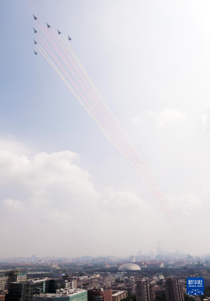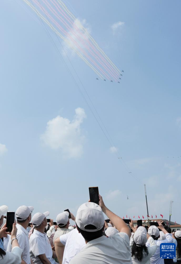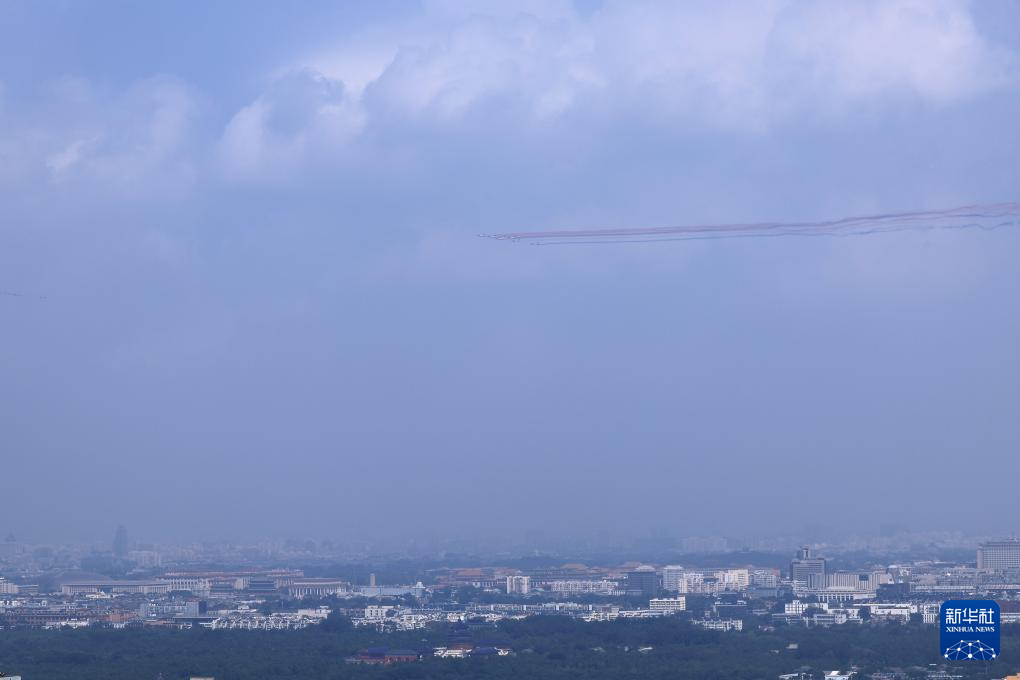 9月3日,纪念中国人民抗日战争暨世界反法西斯战争胜利80周年大会在北京隆重举行。这是教练机梯队飞过天安门广场上空。