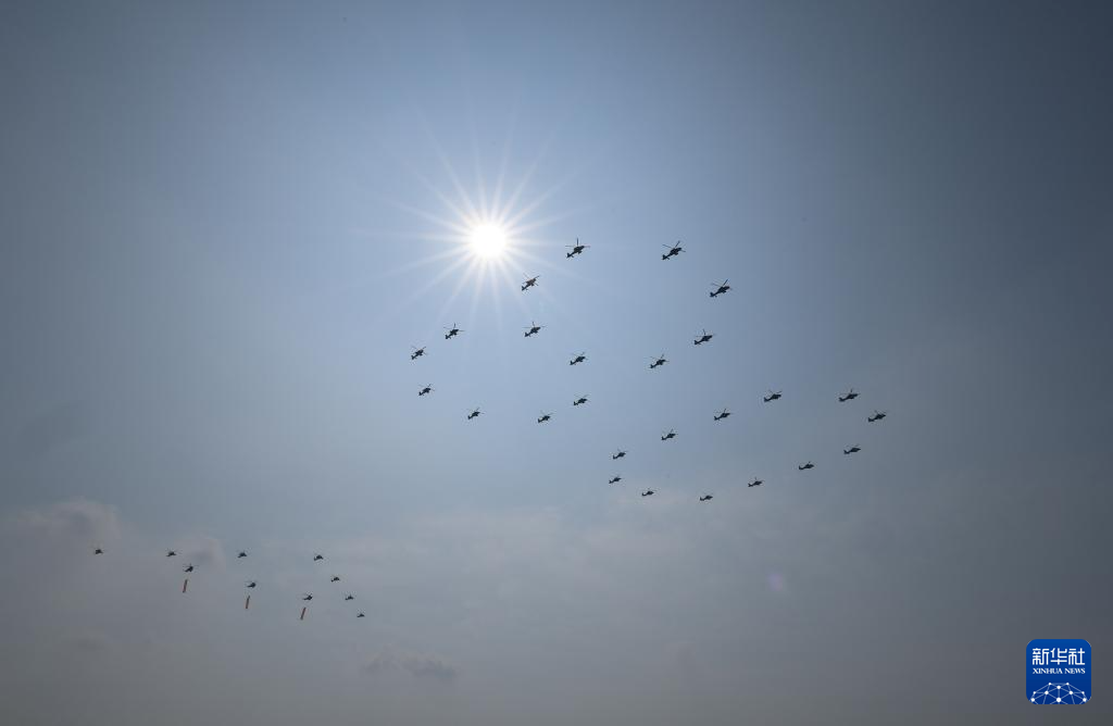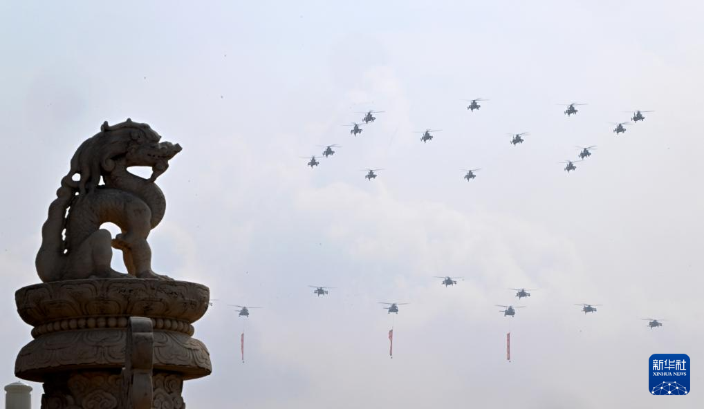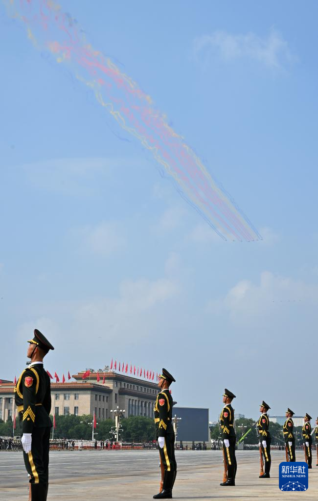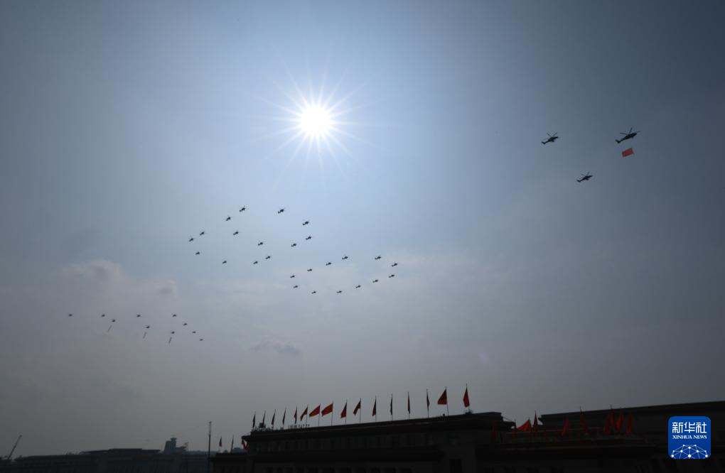 9月3日,纪念中国人民抗日战争暨世界反法西斯战争胜利80周年大会在北京隆重举行。这是空中护旗梯队通过天安门广场。