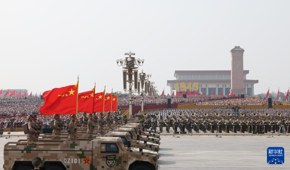 9月3日,纪念中国人民抗日战争暨世界反法西斯战争胜利80周年大会在北京隆重举行。这是战旗方队和装备方队接受检阅。