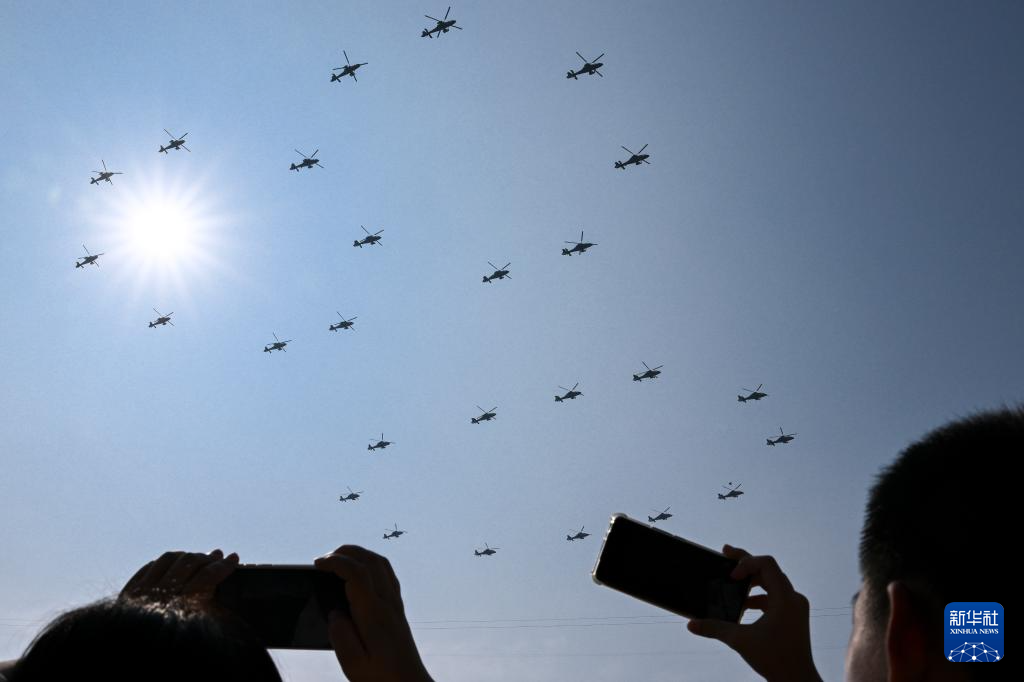 9月3日,纪念中国人民抗日战争暨世界反法西斯战争胜利80周年大会在北京隆重举行。这是空中护旗梯队通过天安门广场。