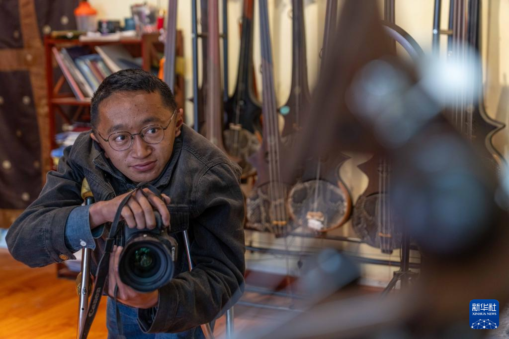 5月6日,拉巴顿珠在公司拍摄同事演奏西藏传统乐器“扎念琴”的照片和视频。新华社记者 旦增尼玛曲珠 摄