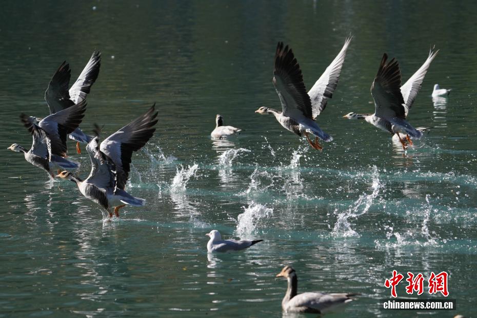 11月17日,西藏拉萨迎来大批越冬候鸟。拉萨河、宗角禄康公园等地,成为了它们的栖息天堂。在宗角禄康公园内,赤麻鸭、斑头雁成群结队,时而低头觅食,时而水中嬉戏。它们的身影引得市民和游客纷纷驻足观赏、拍照留念,构成了一幅人与自然和谐共生的美丽画卷。图为斑头雁从宗角禄康公园上方飞过。贡确 摄