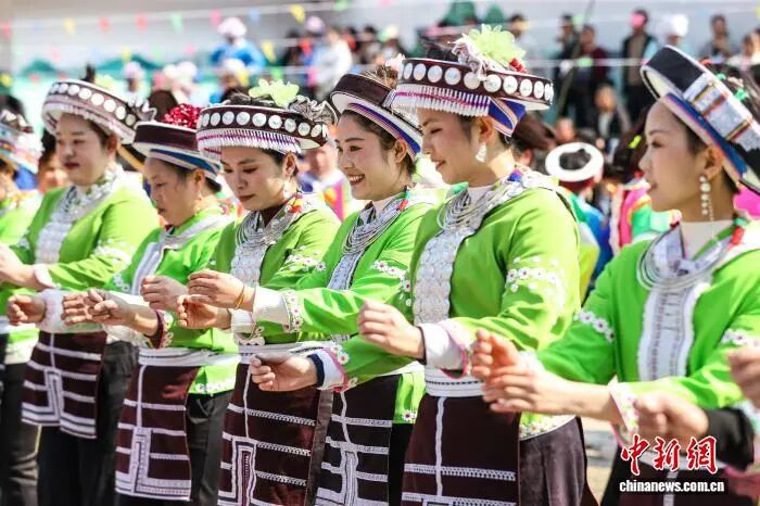 2月21日,贵州省龙里县湾滩河镇果里村举行一年一度的“跳洞”活动。图为苗族民众穿着节日盛装跳舞。瞿宏伦 摄