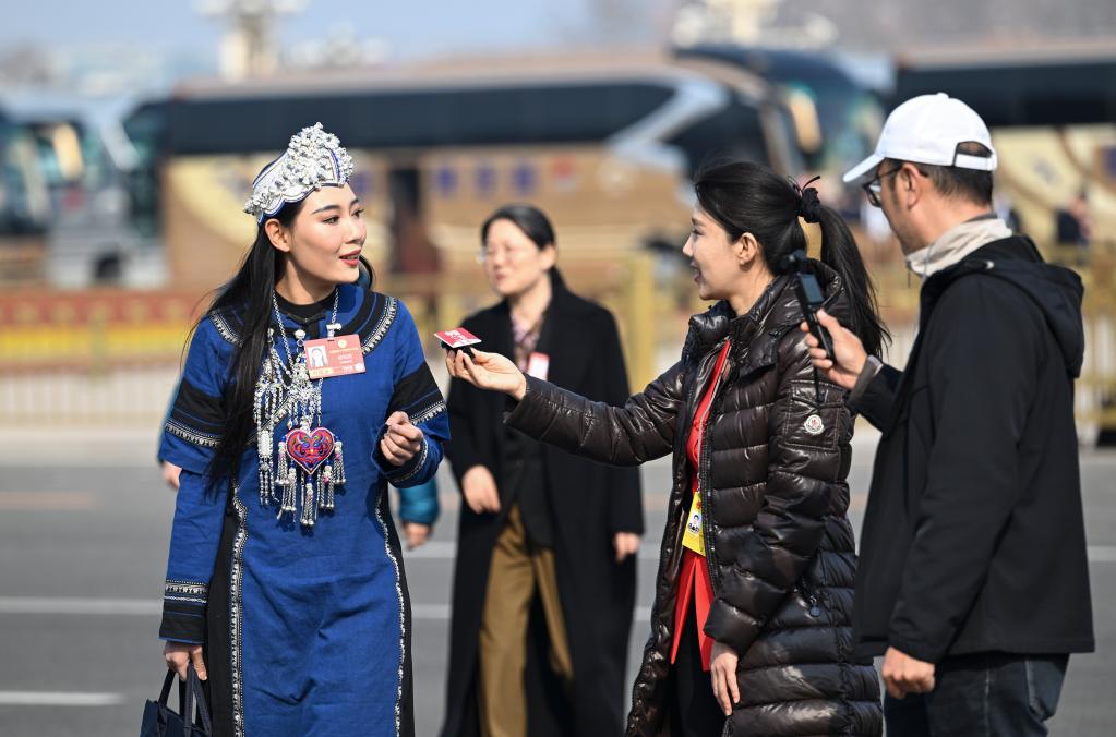 3月8日,全国政协十四届四次会议在北京人民大会堂举行第三次全体会议。这是记者在采访全国政协委员。新华社记者 李贺 摄