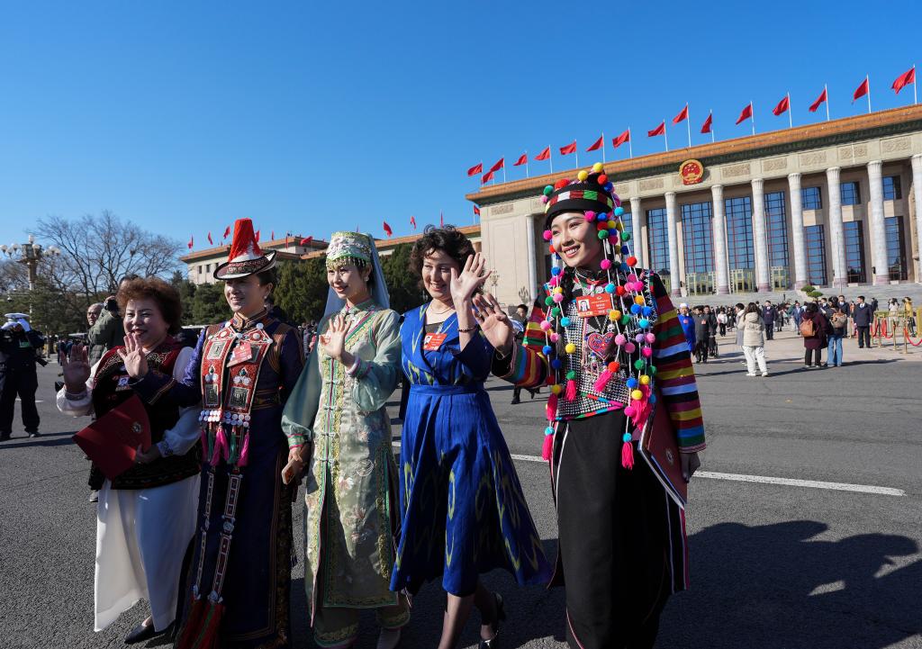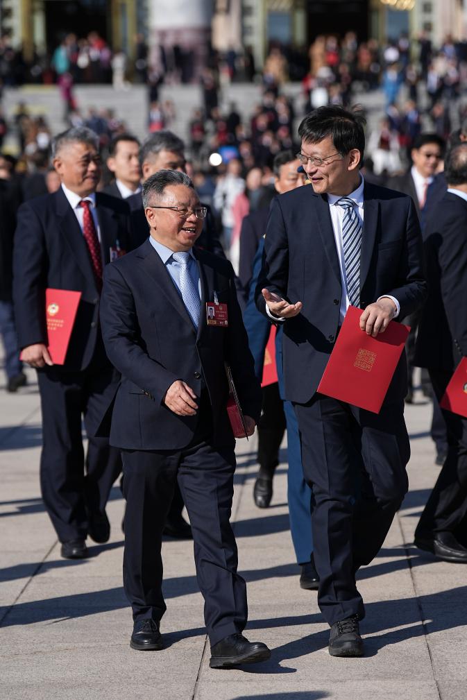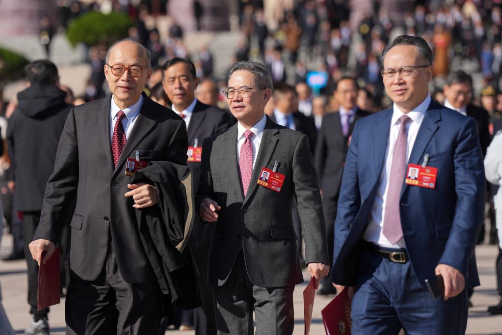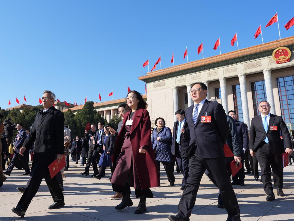3月11日,全国政协十四届四次会议在北京人民大会堂举行闭幕会。这是闭幕会后,委员们走出人民大会堂。新华社记者 王曦 摄