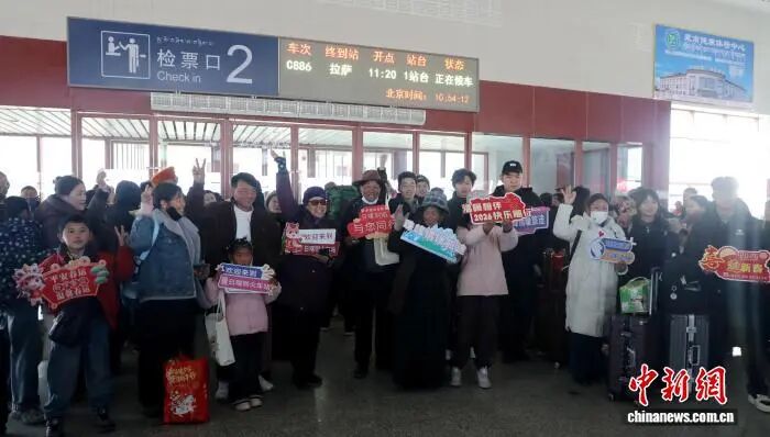 图为即将乘坐春运列车回家的旅客在日喀则站合影。格桑央珍 摄