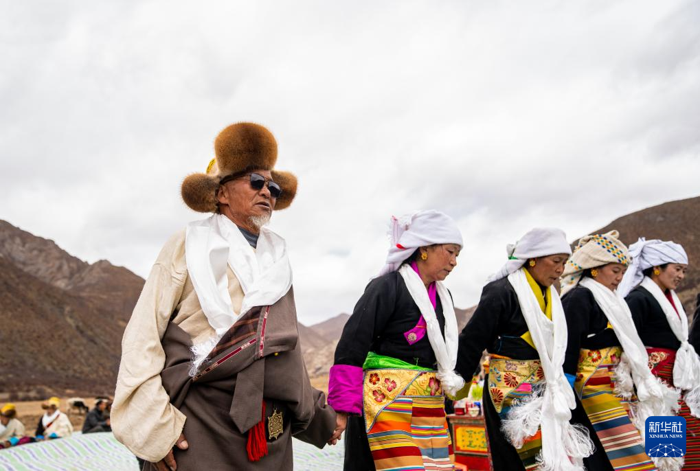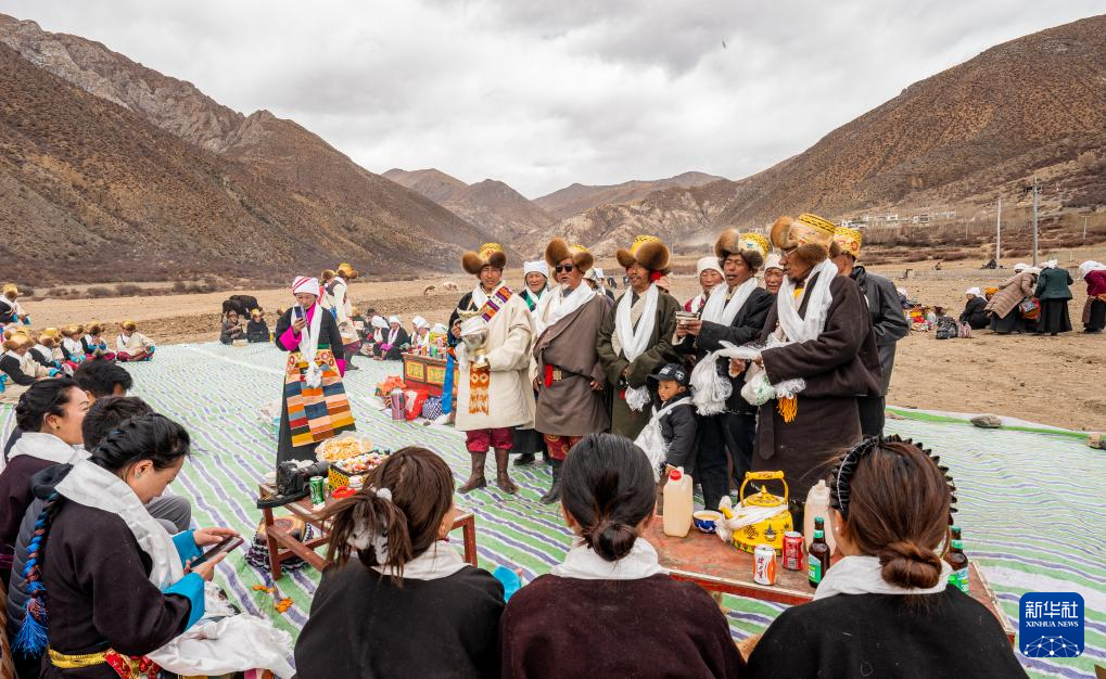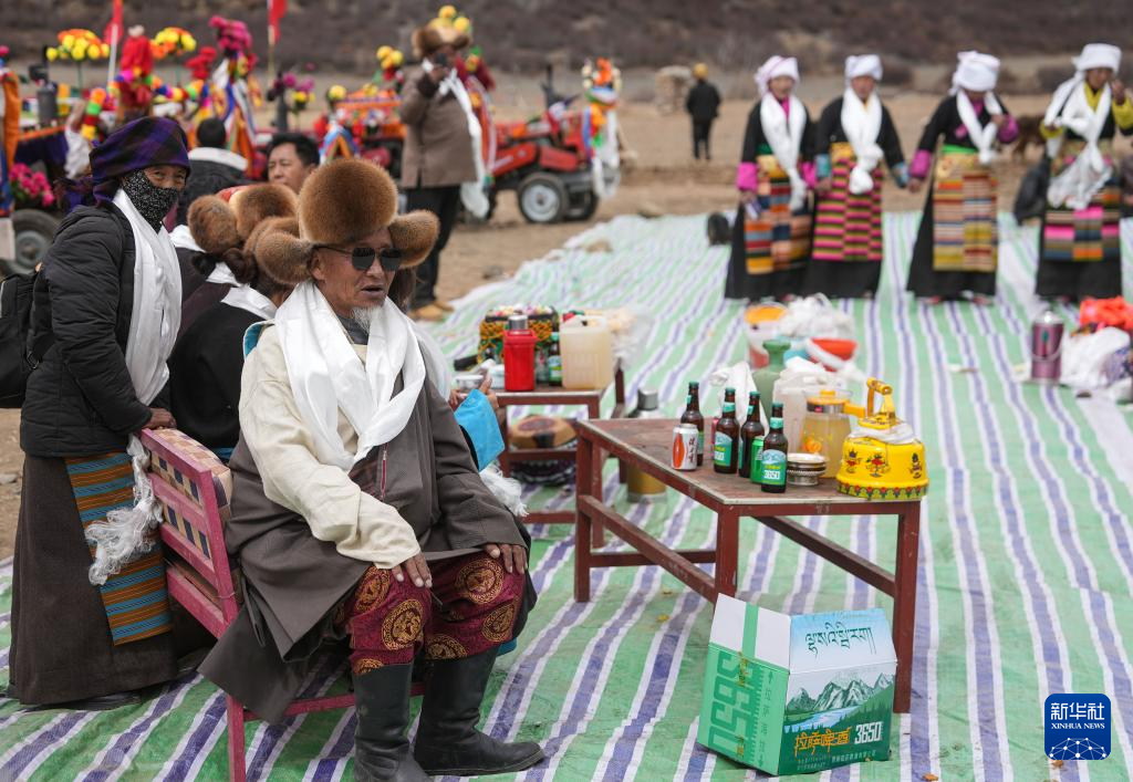 旺庆老人(前排带墨镜者)在春耕大典上为客人敬酒献唱(3月16日摄)。新华社记者 丁增尼达 摄
