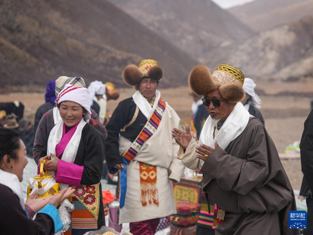 旺庆老人(右)在春耕大典上为客人敬酒献唱(3月16日摄)。新华社记者 晋美多吉 摄
